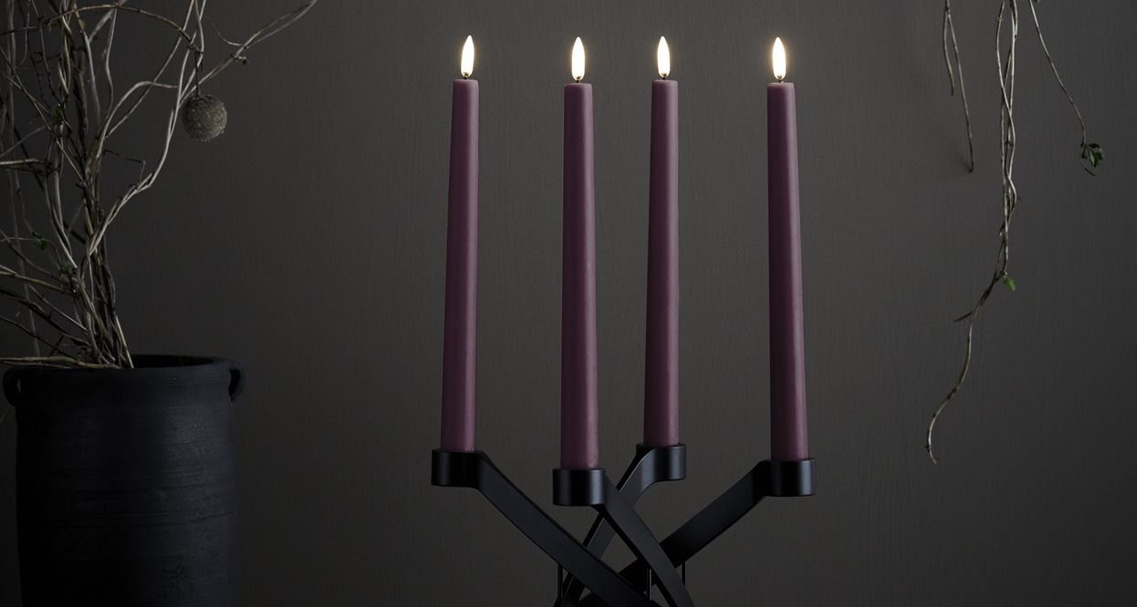 The Plum Taper Gift Set includes 4 x smooth Plum Taper Candles paired with two matte black LightArch Candleholders. Designed to be styled together, the Tapers and Candleholders create a sculptural, contemporary display that completes any dining table or interior setting with refined elegance.