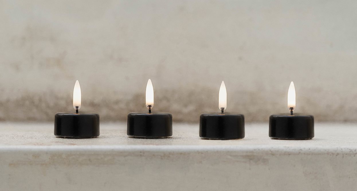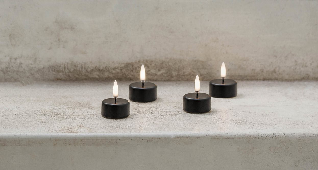 Included in the set are four 4 x 2,1 cm LED Tealights 400~ in Plain Black